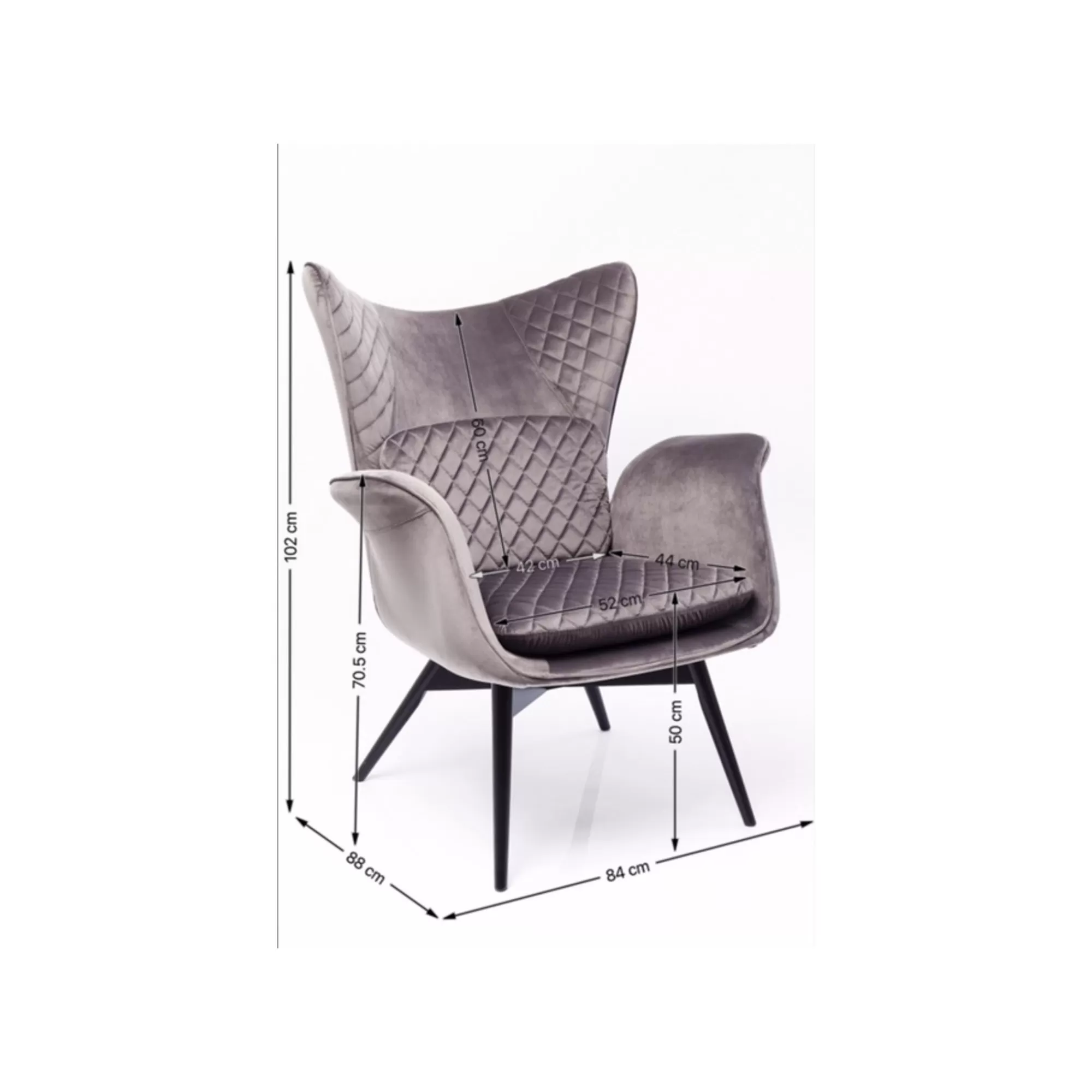 Un fauteuil en velours au look contemporain qui s’associe au style classique du fauteuil à oreilles. Avec ses formes extravagantes et ses détails pleins de caractère, cet ensemble est une véritable déclaration, à la fois rétro et moderne. Son rembourrage généreux, son revêtement en velours, ses accoudoirs et son large repose tête garantissent un fauteuil confortable et très doux au toucher.