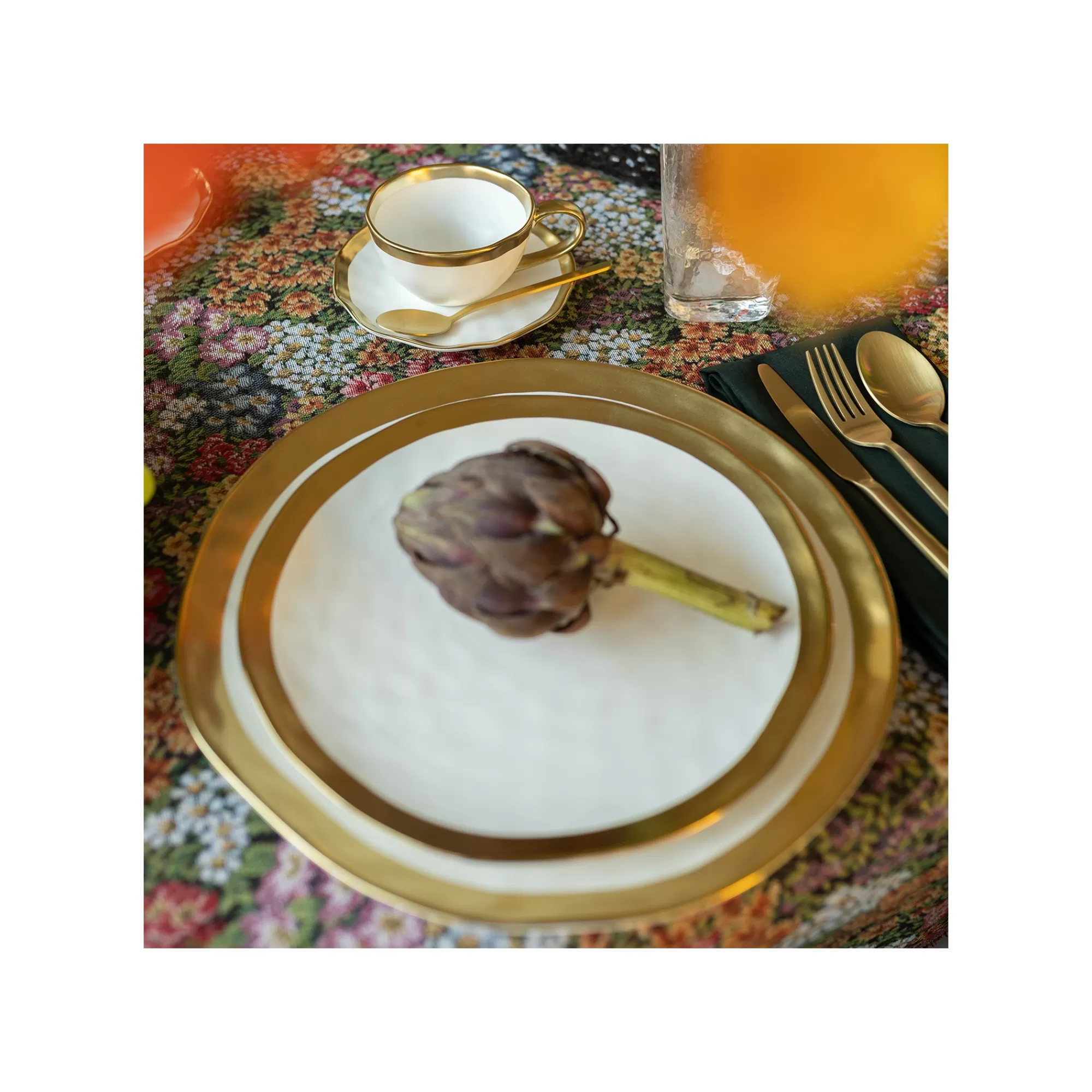 La gamme Bell vous propose une série de bols, tasses, plats et assiettes. En porcelaine blanche avec le bord doré, elle apporte de l’élégance à vos repas.