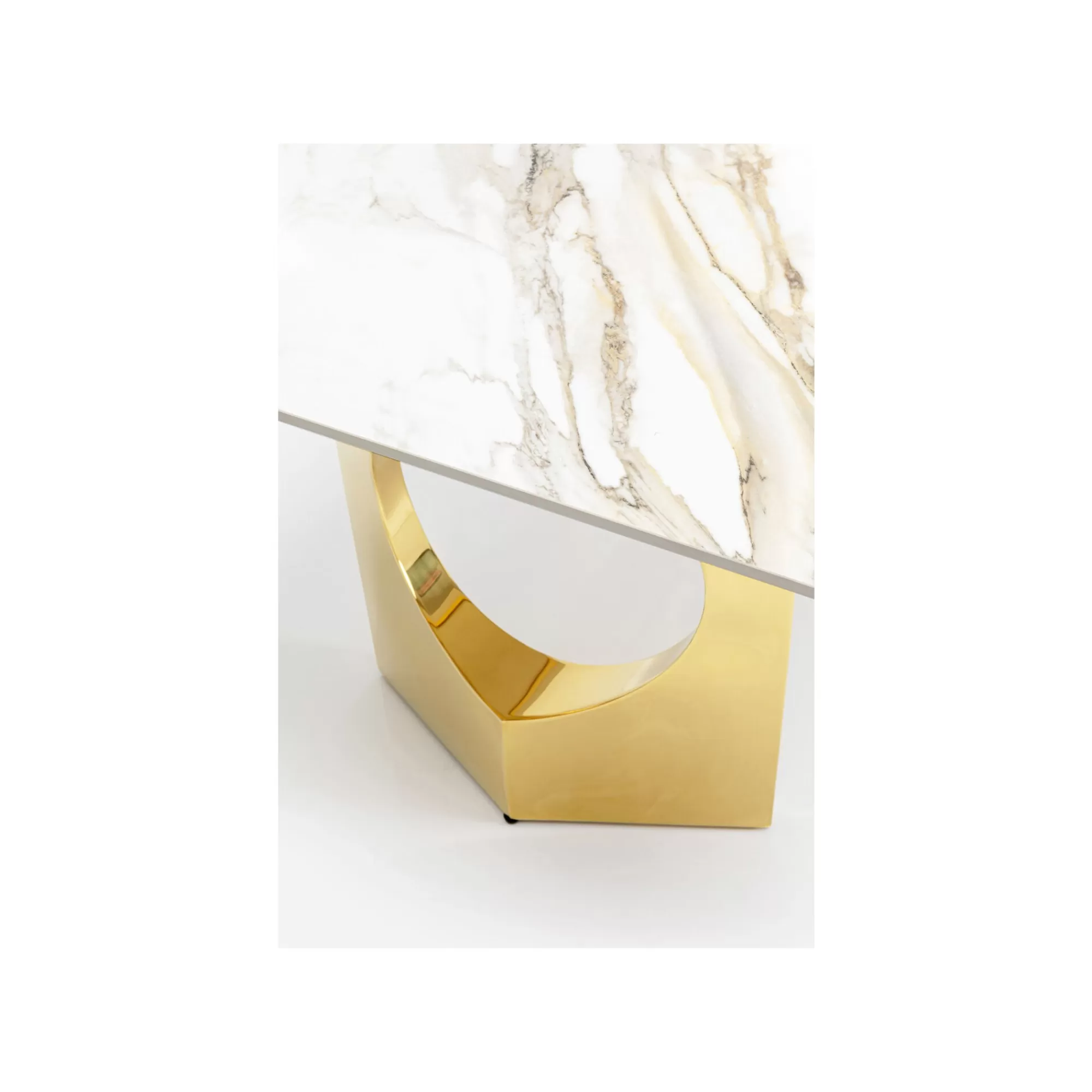 Cette table complète votre décoration élégante avec son plateau en grès blanc marbré et ses pieds en acier doré à la silhouette design.