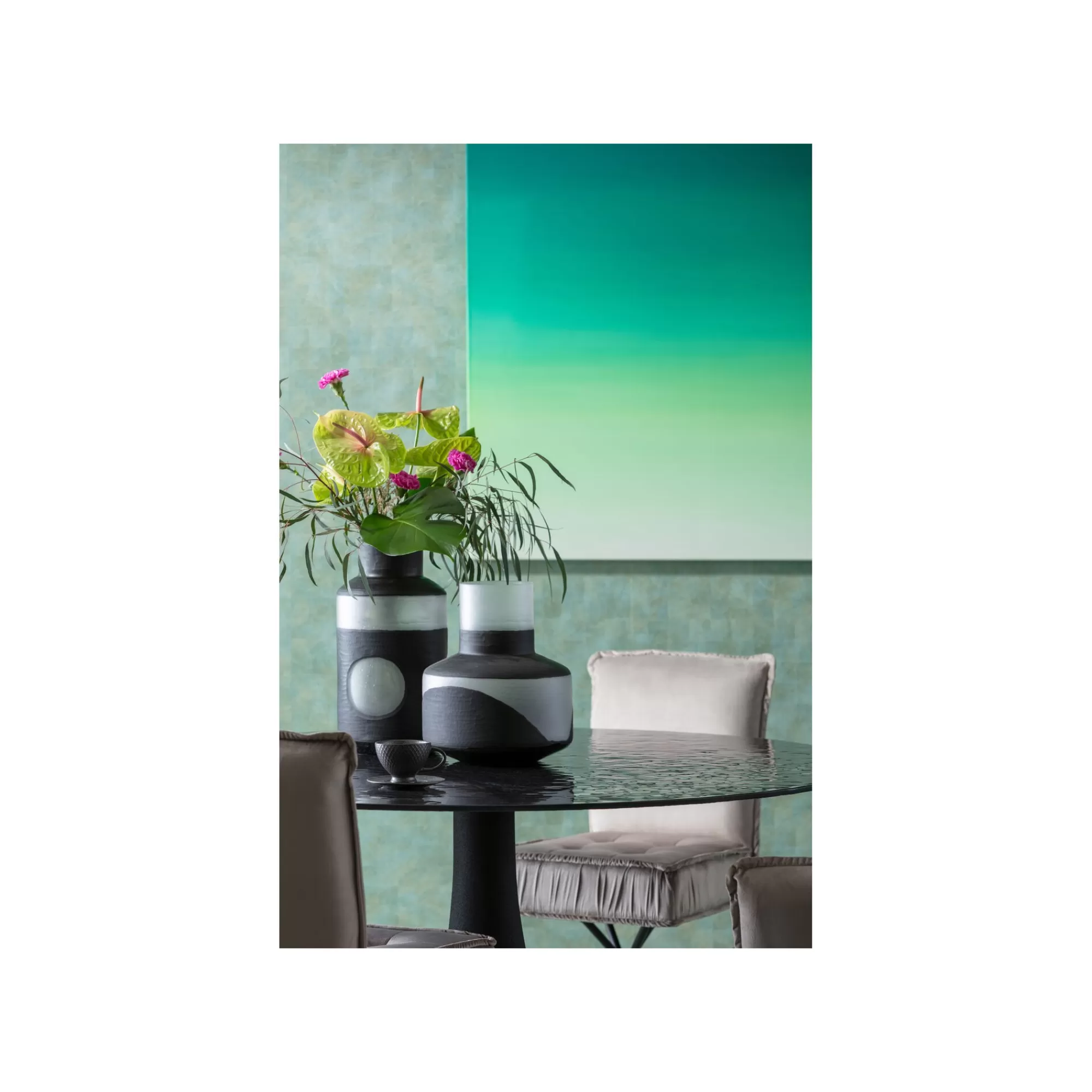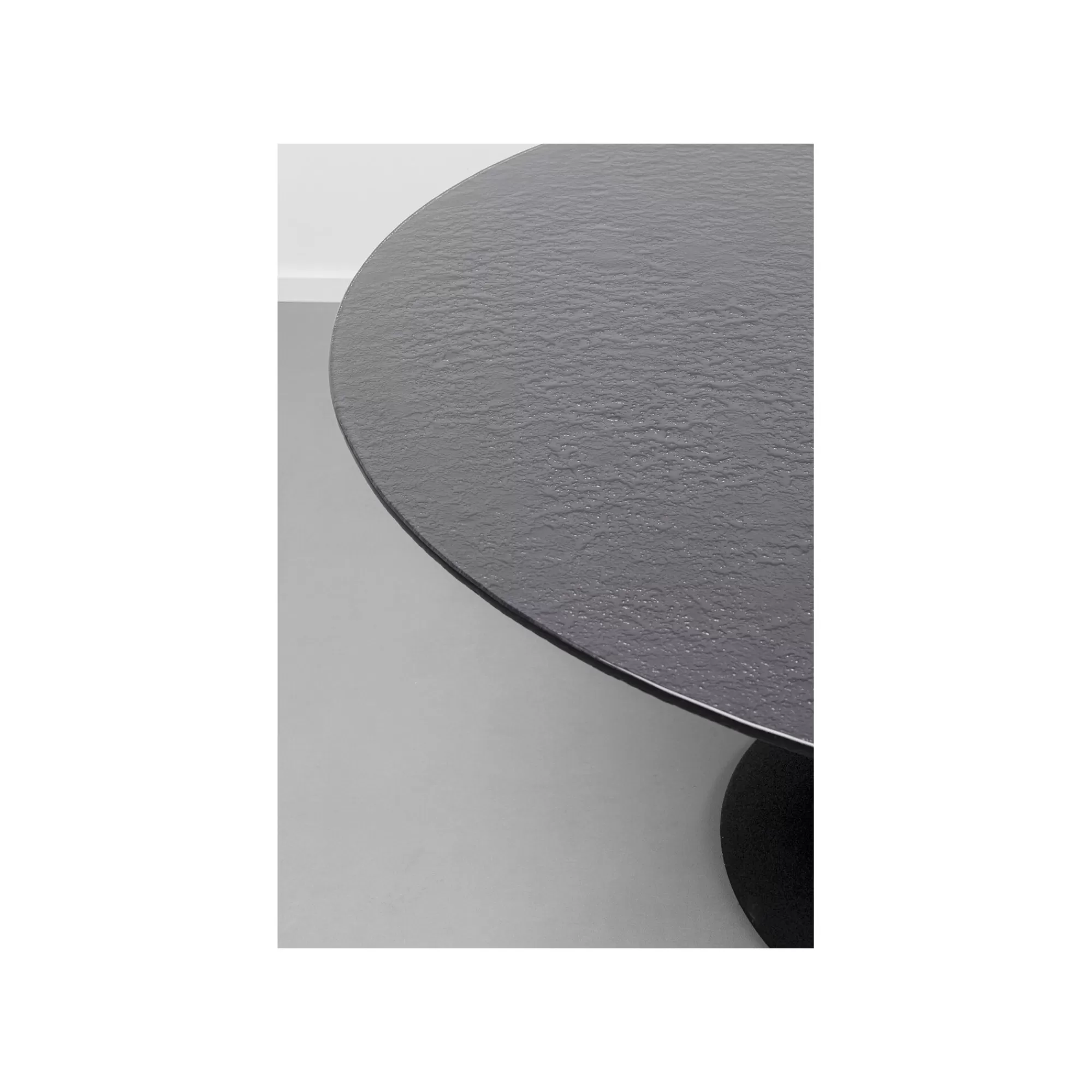 Cette table à manger ronde s’inscrit dans un design contemporain avec son pied tulipe en aluminium poudré combiné à un plateau en verre noir texturé.