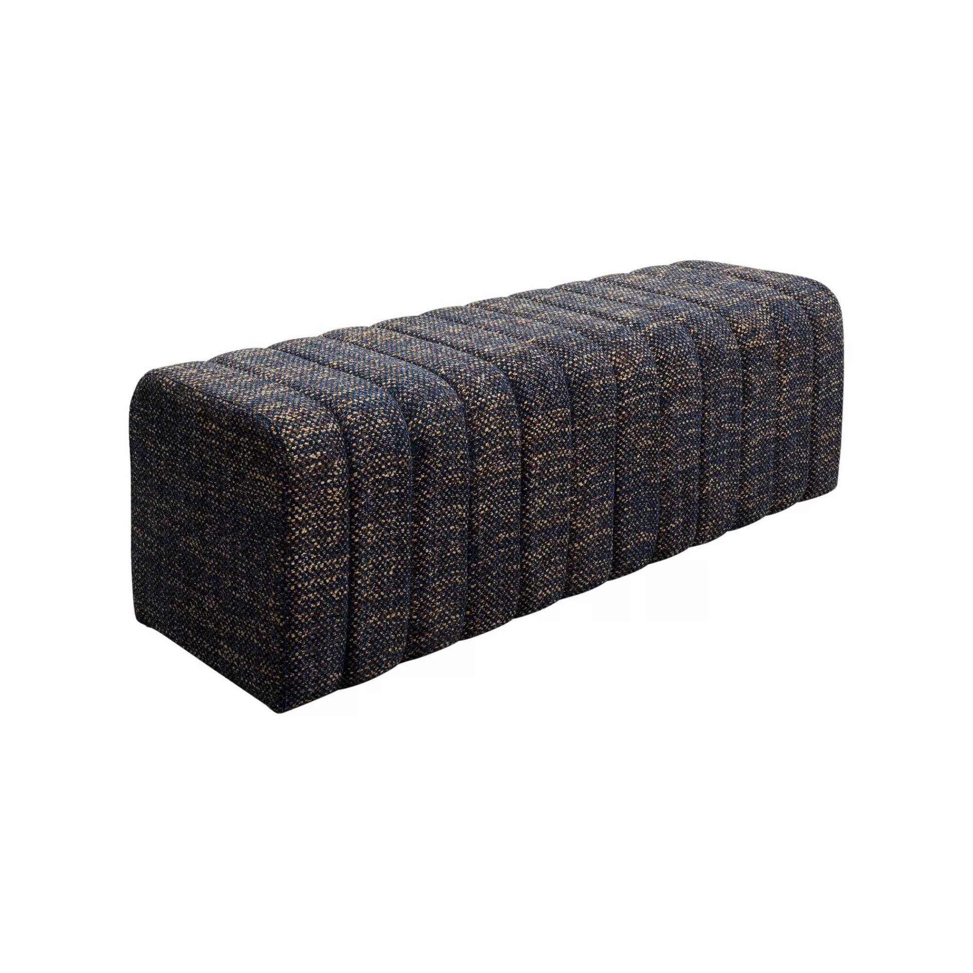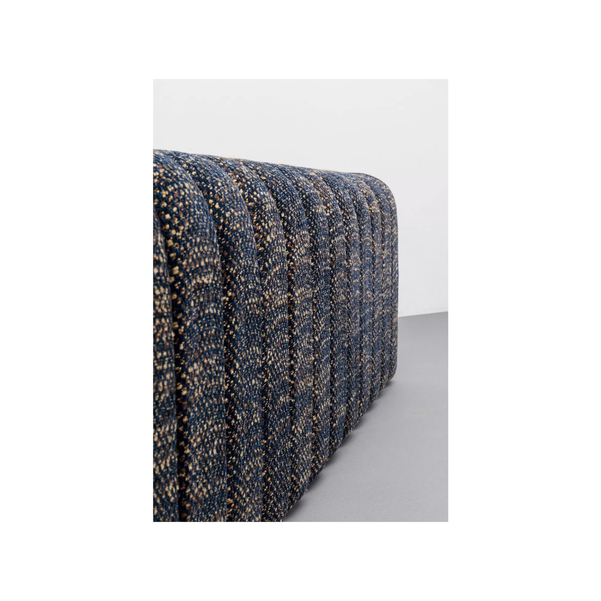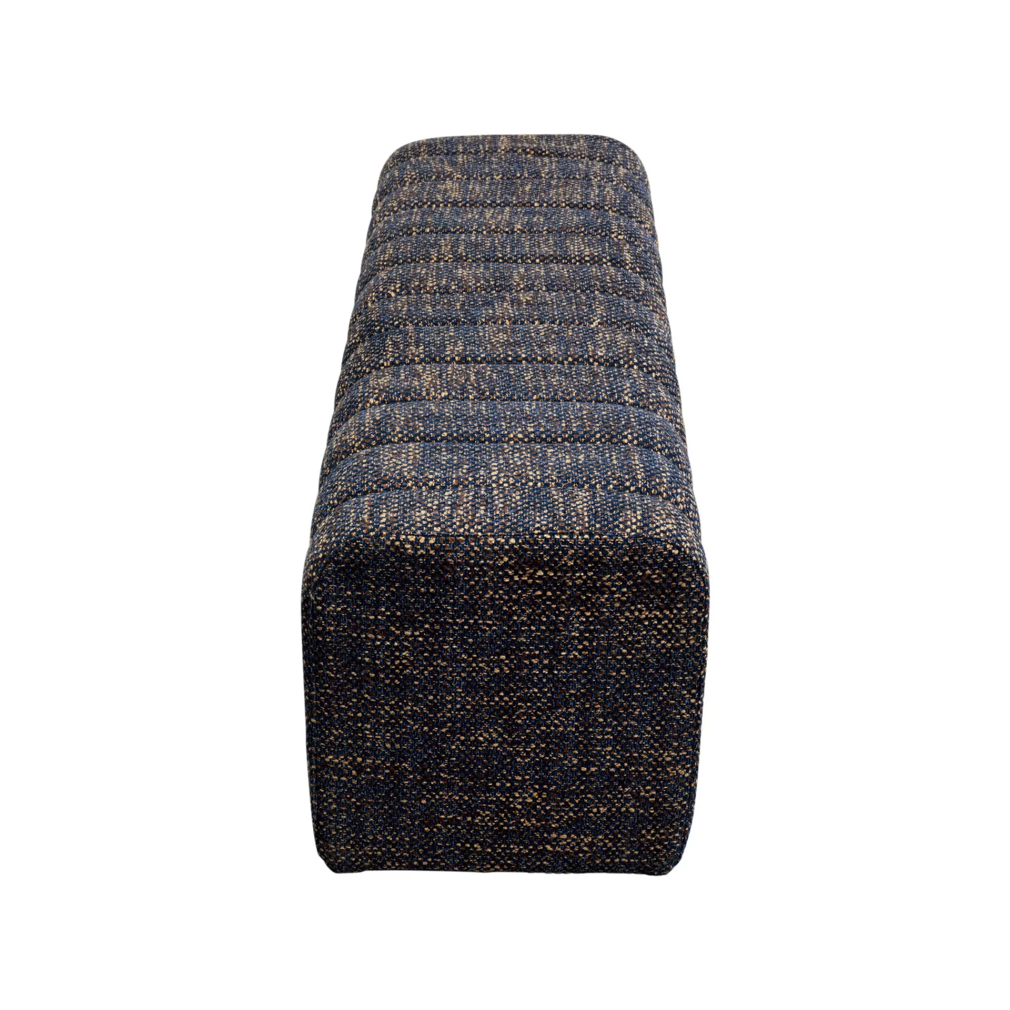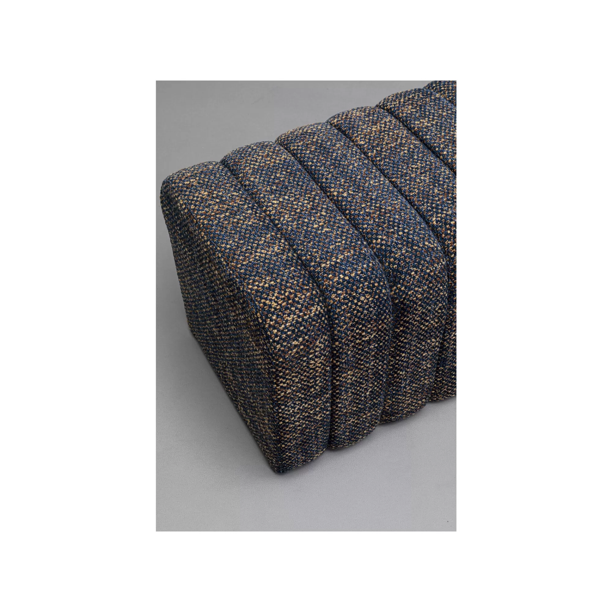 Ce banc s’inscrit dans une esthétique contemporaine avec sa forme en bloc ainsi que son mélange de bleu et de marron tressé à la manière d’un filet.