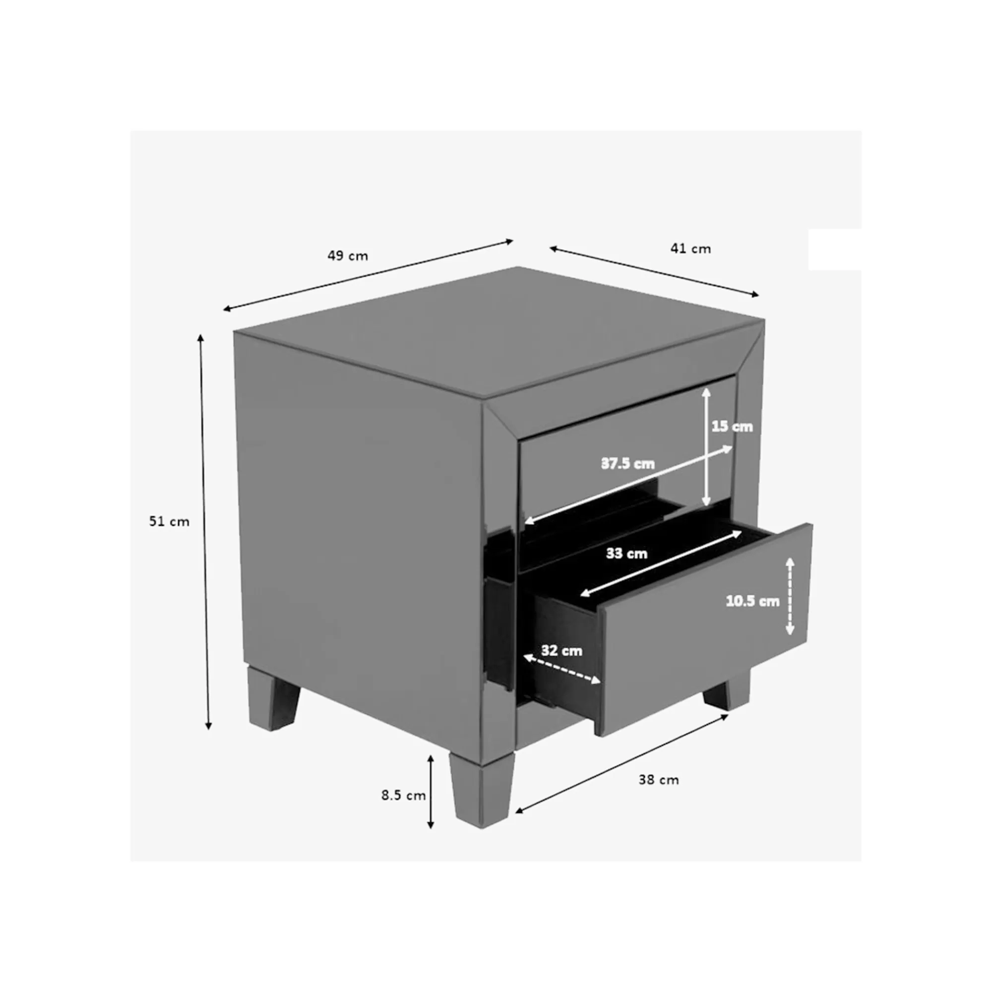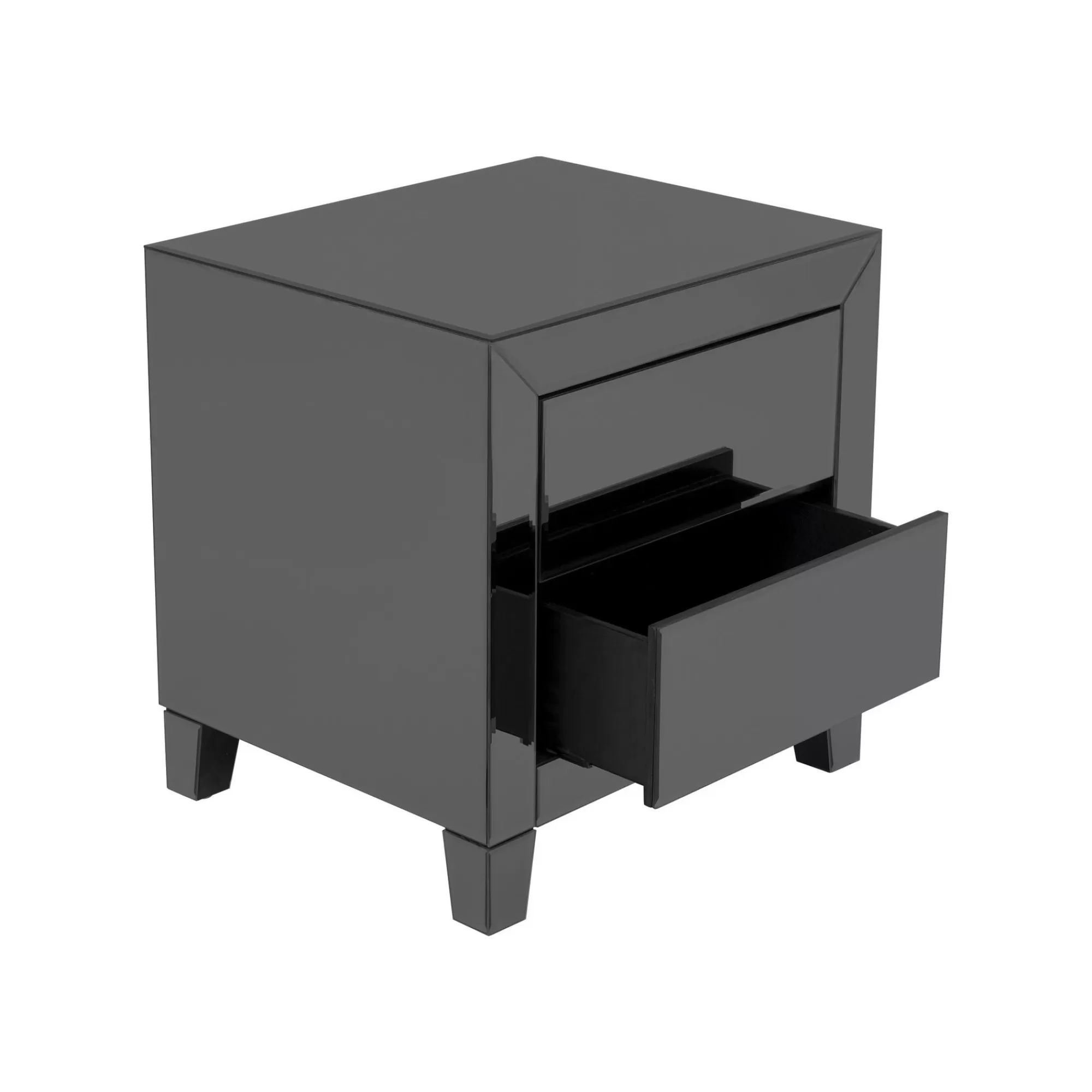 Ce chevet, au design moderne et élégant, est composé de panneaux en miroir teint. Ses 2 tiroirs s’ouvrent à l’aide d’une fonction « push-to-open » ce qui rend le meuble très pratique et fonctionnel. Il est issu de la gamme Luxury qui comprend également un buffet et un chiffonnier.