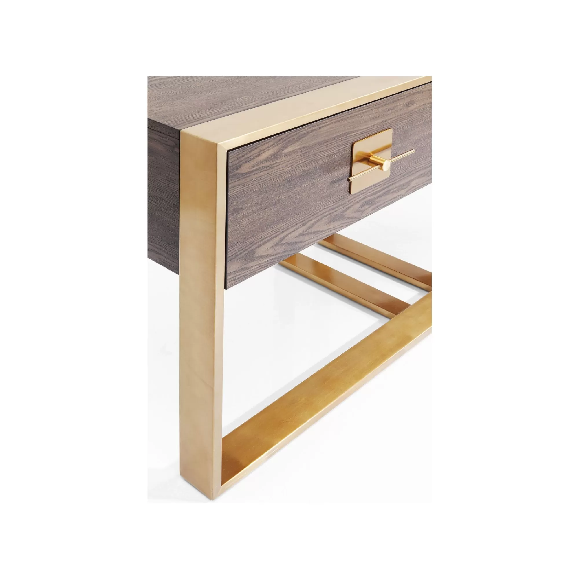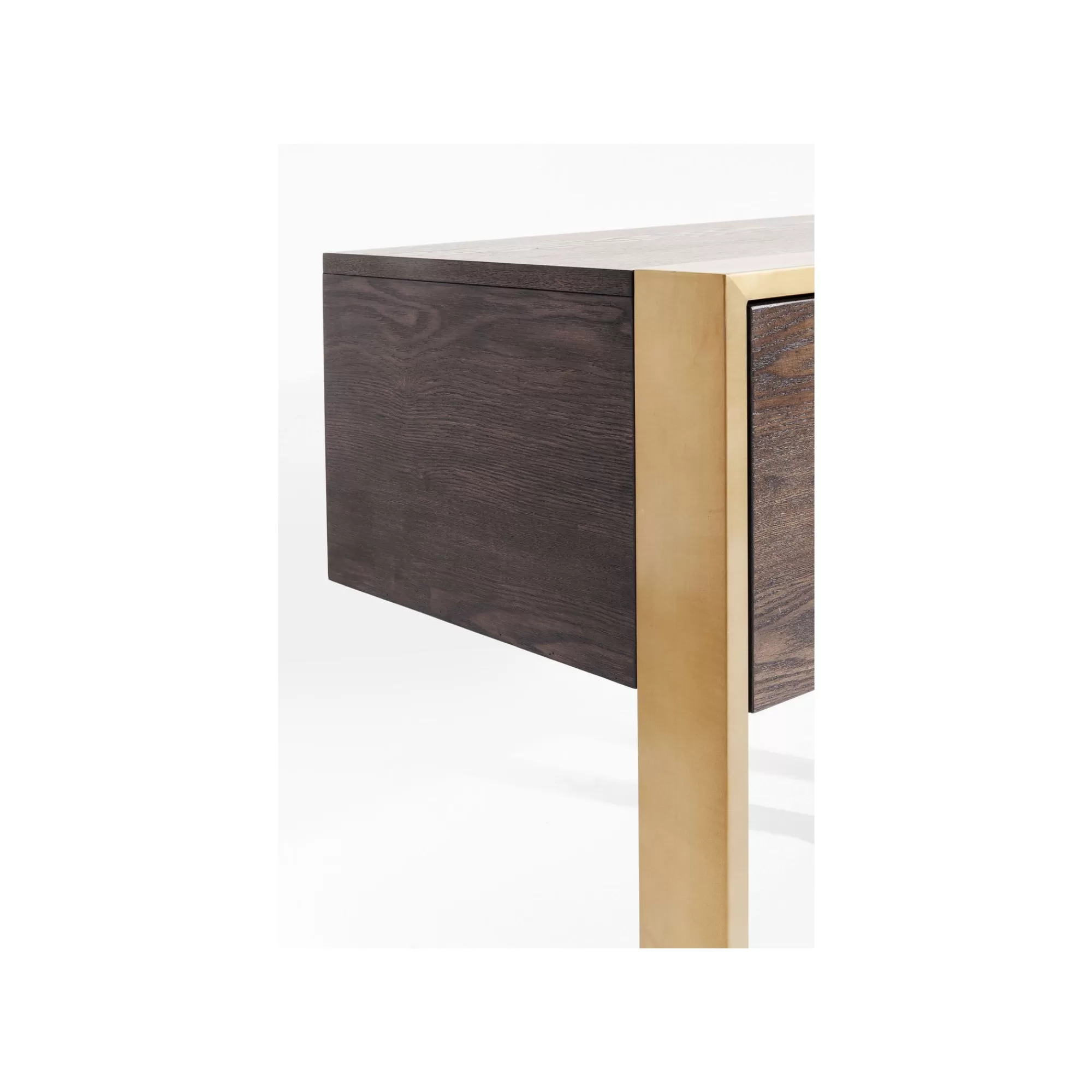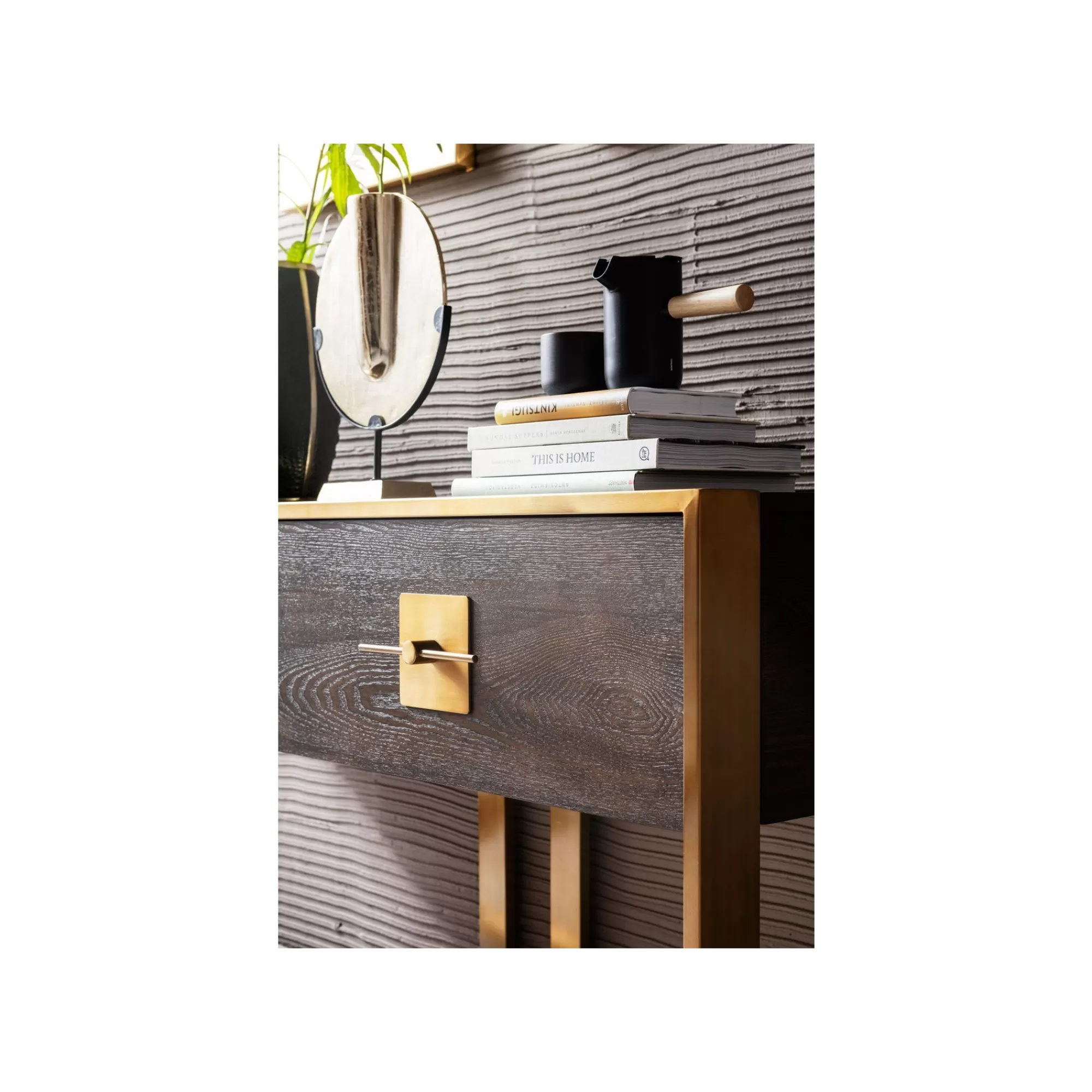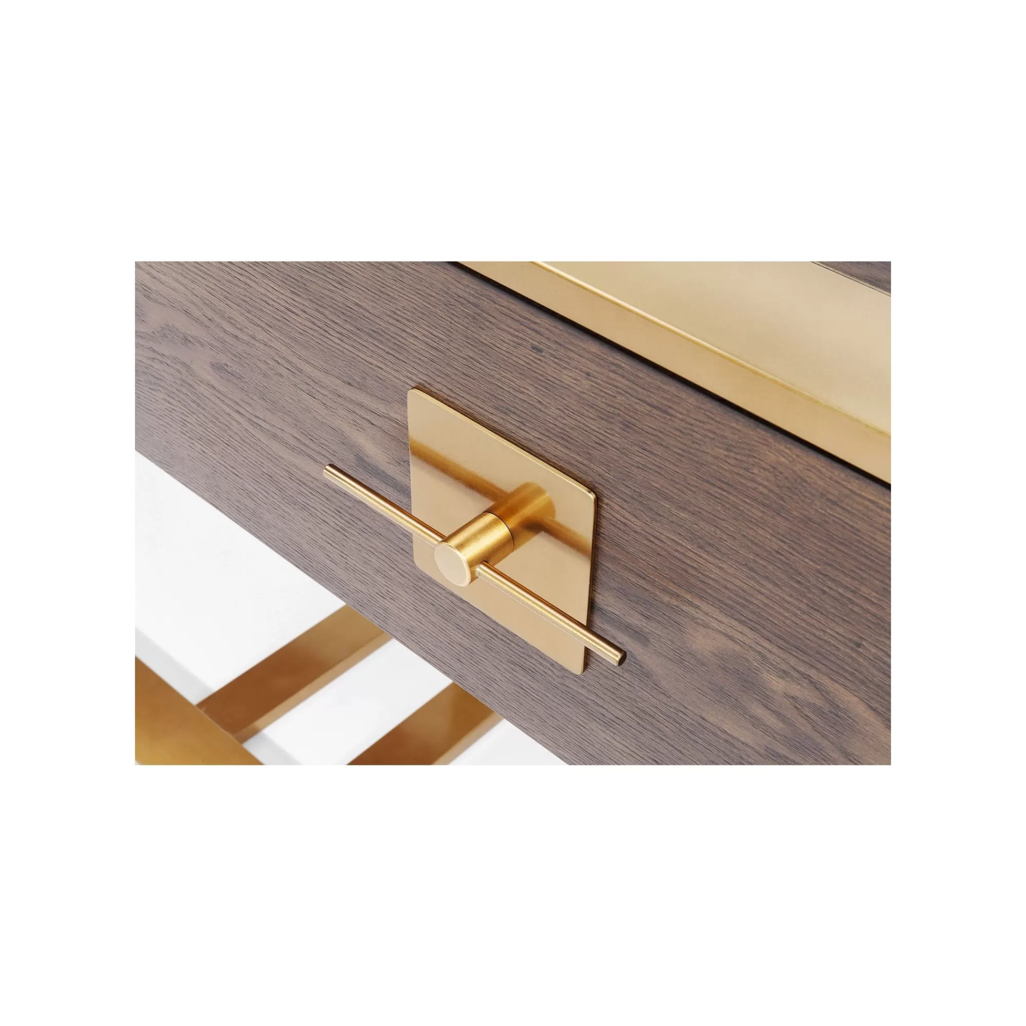 Cette console s’inscrit dans une esthétique rétro avec sa structure en frêne verni soulignée par des accents dorés. Sa façade est mise en avant par deux larges poignées et un cadre en métal qui inclut le piètement. La collection Osaka inclut également un buffet, un bureau, une table basse, une table à manger, un chevet et une étagère.