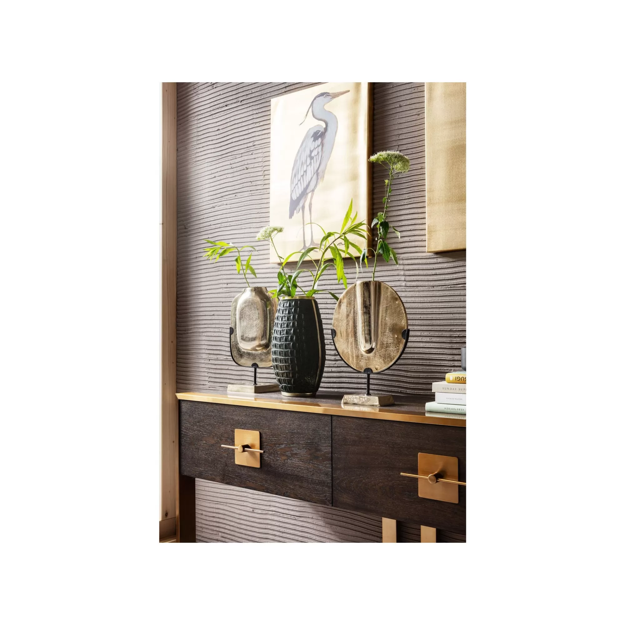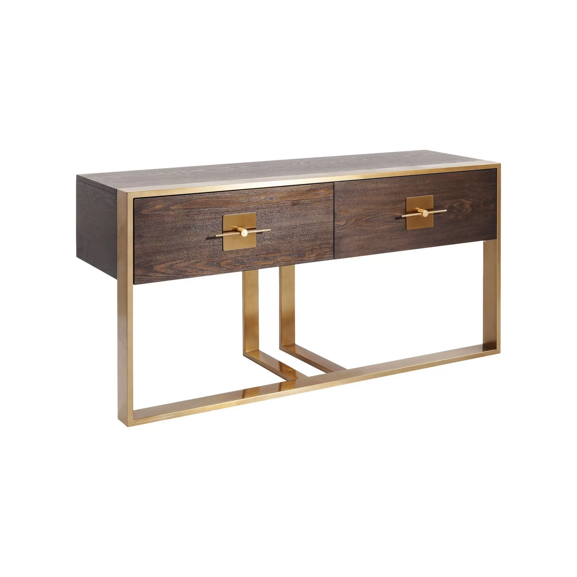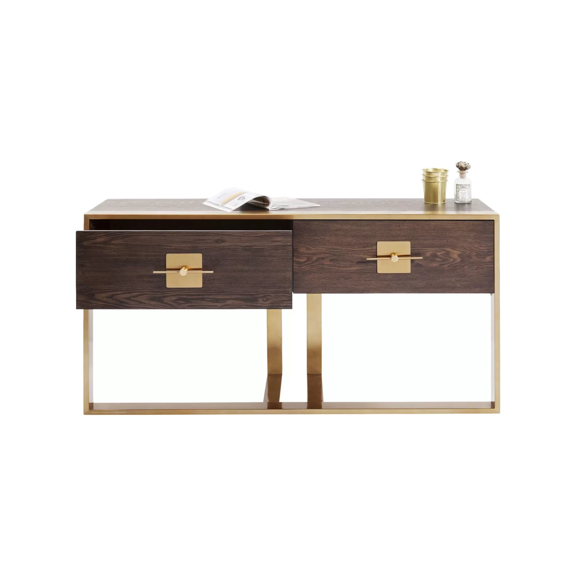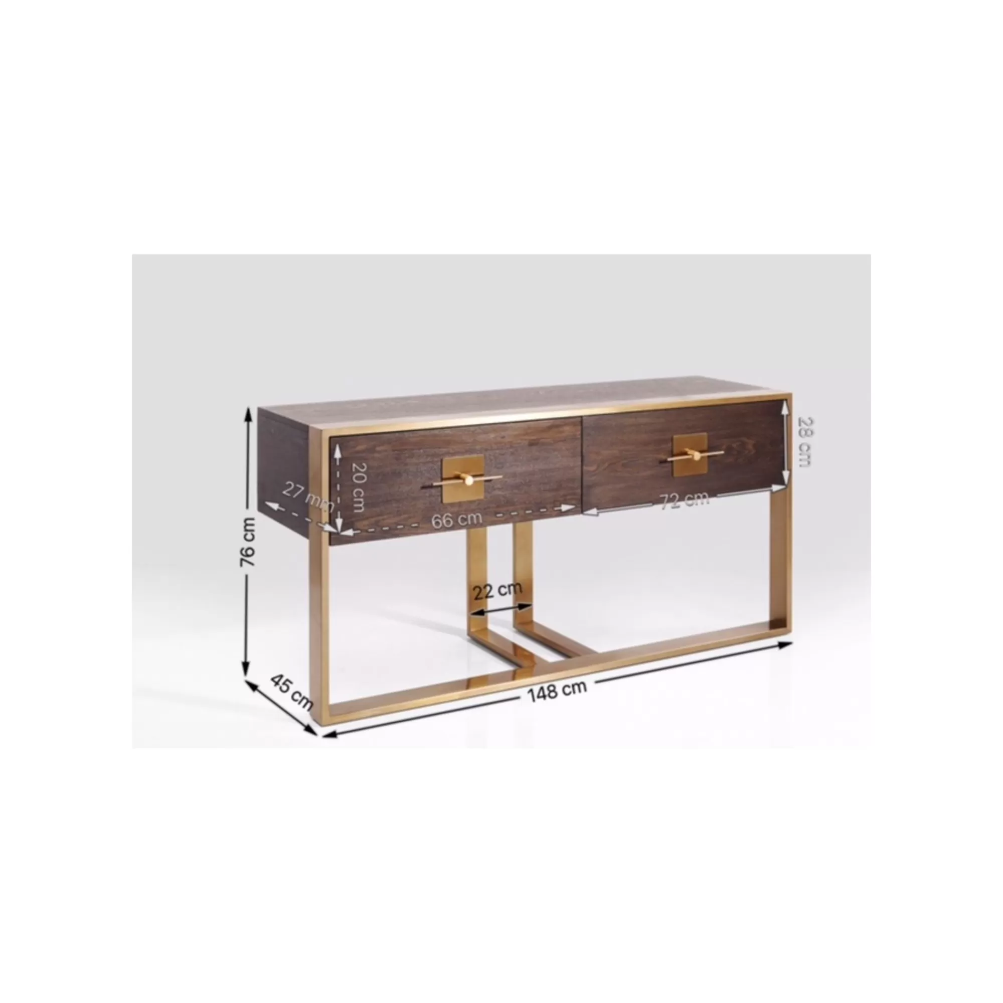 Cette console s’inscrit dans une esthétique rétro avec sa structure en frêne verni soulignée par des accents dorés. Sa façade est mise en avant par deux larges poignées et un cadre en métal qui inclut le piètement. La collection Osaka inclut également un buffet, un bureau, une table basse, une table à manger, un chevet et une étagère.